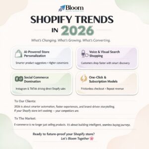 At Bloom Agency, we collaborate with the brands to keep up with the most influential shopify store trends in 2026 and ensure that they do not fall behind in the ever-evolving market, which is turning into a more data-driven environment. The platform itself evolved into more than a basic webpage creator and became a complex commerce platform that combines AI, headless platform, and omnichannel selling.